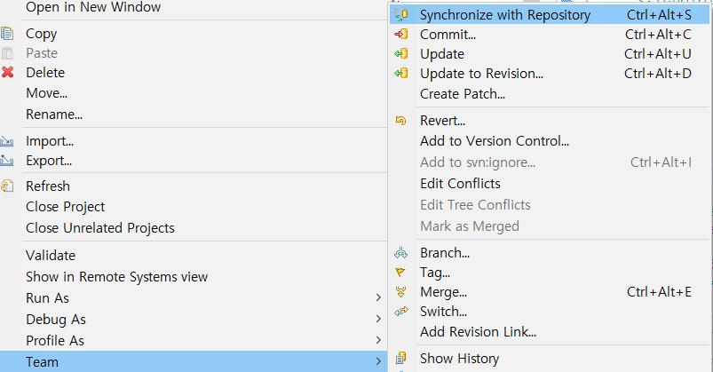 ํ๋ก์ ํธ์์ ์ค๋ฅธ์ชฝ ๋ง์ฐ์ค ํด๋ฆญ ํ Team > Synchronize with Repository