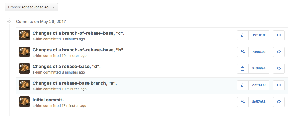 ์ปค๋ฐ a๋ ๋ถ๋ชจ๋ก ์ปค๋ฐ e๋ฅผ ๊ฐ์ง๋ฉฐ, Rebase and Merge ์์ ํ์๋ ์์ ํ๋ ๋ธ๋ ์น์ a, b, c ์ปค๋ฐ๋ค์ ๋จธ์ง ํ์ ๋ฉ์ธ ๋ธ๋ ์น์ Init, d, e, a, b, c ์ปค๋ฐ๋ค๊ณผ ์ฐ๊ด ๊ด๊ณ๋ฅผ ๊ฐ์ง์ง ์๋๋ค.