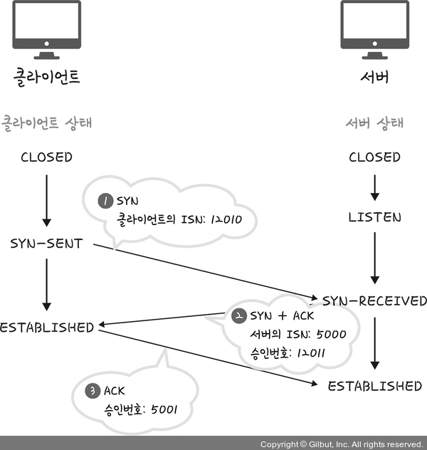 ํด๋ผ์ด์ธํธ์ ์๋ฒ๊ฐ ํต์ ํ ๋ ์์ ๊ฐ์ ์ธ ๋จ๊ณ๋ฅผ ๊ฑฐ์น๋๋ฐ, ์ด๋ ๊ฒ 3-์จ์ด ํธ๋์ ฐ์ดํฌ ๊ณผ์ ์ดํ ์ ๋ขฐ์ฑ์ด ๊ตฌ์ถ๋๊ณ ๋ฐ์ดํฐ ์ ์ก์ ์์ํ๊ธฐ ๋๋ฌธ์ TCP๋ ์ ๋ขฐ์ฑ์ด ์๋ ๊ณ์ธต์ด๋ผ๊ณ ํ๋ฉฐ UDP๋ ์ด ๊ณผ์ ์ด ์์ด ์ ๋ขฐ์ฑ์ด ์๋ ๊ณ์ธต์ด๋ผ๊ณ ํ๋ค.