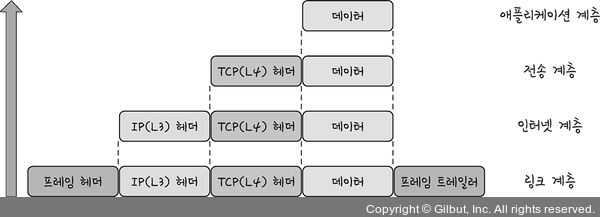 - ์บก์ํ ๊ณผ์ ์ ์์ ๊ณ์ธต์ ํค๋์ ๋ฐ์ดํฐ๋ฅผ ํ์ ๊ณ์ธต์ ๋ฐ์ดํฐ ๋ถ๋ถ์ ํฌํจ์ํค๊ณ ํด๋น ๊ณ์ธต์ ํค๋๋ฅผ ์ฝ์ ํ๋ ๊ณผ์ ์ ๋งํ๋ค.- ์ ํ๋ฆฌ์ผ์ด์ ๊ณ์ธต์ ๋ฐ์ดํฐ๊ฐ ์ ์ก ๊ณ์ธต์ผ๋ก ์ ๋ฌ๋๋ฉด์ ‘์ธ๊ทธ๋จผํธ’ ๋๋ ‘๋ฐ์ดํฐ๊ทธ๋จ’ํ๋๋ฉฐ TCP(L4) ํค๋๊ฐ ๋ถ์ฌ์ง๊ฒ ๋๋ค. ๊ทธ๋ฆฌ๊ณ ์ดํ ์ธํฐ๋ท ๊ณ์ธต์ผ๋ก ๊ฐ๋ฉด์ IP(L3) ํค๋๊ฐ ๋ถ์ฌ์ง๊ฒ ๋๋ฉฐ ‘ํจํท’ํ๊ฐ ๋๊ณ , ์ดํ ๋งํฌ ๊ณ์ธต์ผ๋ก ์ ๋ฌ๋๋ฉด์ ํ๋ ์ ํค๋์ ํ๋ ์ ํธ๋ ์ผ๋ฌ๊ฐ ๋ถ์ด ‘ํ๋ ์’ํ๊ฐ ๋๋ค.