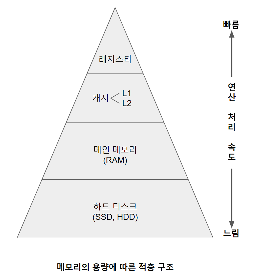์ค์ ๋ก ๋ฉ๋ชจ๋ฆฌ์ CPU์ฌ์ด์ ์๋ ์ฐจ์ด๊ฐ ๋๋ฌด ํฌ๊ธฐ ๋๋ฌธ์ ๊ทธ ์ค๊ฐ์ ๋ ์ง์คํฐ ๊ณ์ธต์ ๋ฌ์ ์๋ ์ฐจ์ด๋ฅผ ํด๊ฒฐํ๋๋ฐ, ์๋ ์ฐจ์ด๋ฅผ ํด๊ฒฐํ๊ธฐ ์ํด ๊ณ์ธต๊ณผ ๊ณ์ธต ์ฌ์ด์ ์ด์ด ๊ณ์ธต์ ์บ์ฑ ๊ณ์ธต์ด๋ผ๊ณ ํ๋ค. ์๋ฅผ ๋ค์ด ์บ์ ๋ฉ๋ชจ๋ฆฌ์ ๋ณด์กฐ๊ธฐ์ต์ฅ์น ์ฌ์ด์ ์๋ ์ฃผ๊ธฐ์ต์ฅ์น๋ฅผ ๋ณด์กฐ๊ธฐ์ต์ฅ์น์ ์บ์ฑ ๊ณ์ธต์ด๋ผ๊ณ ํ ์ ์๋ค.